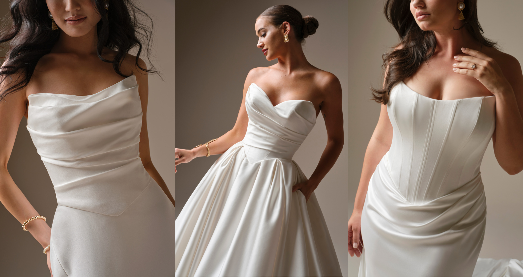 Sinclaire is proof that clean, sculpted, and seriously flattering can still feel soft and romantic. This satin fit-and-flare features a corset-inspired bodice that hugs in all the right places, with a subtly draped skirt that adds just enough movement and drama. Polished, confident, and effortlessly chic, Sinclaire is made for brides who want a timeless silhouette with a modern, curve-loving twist.